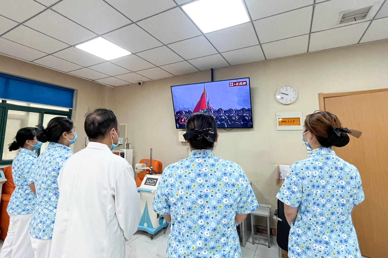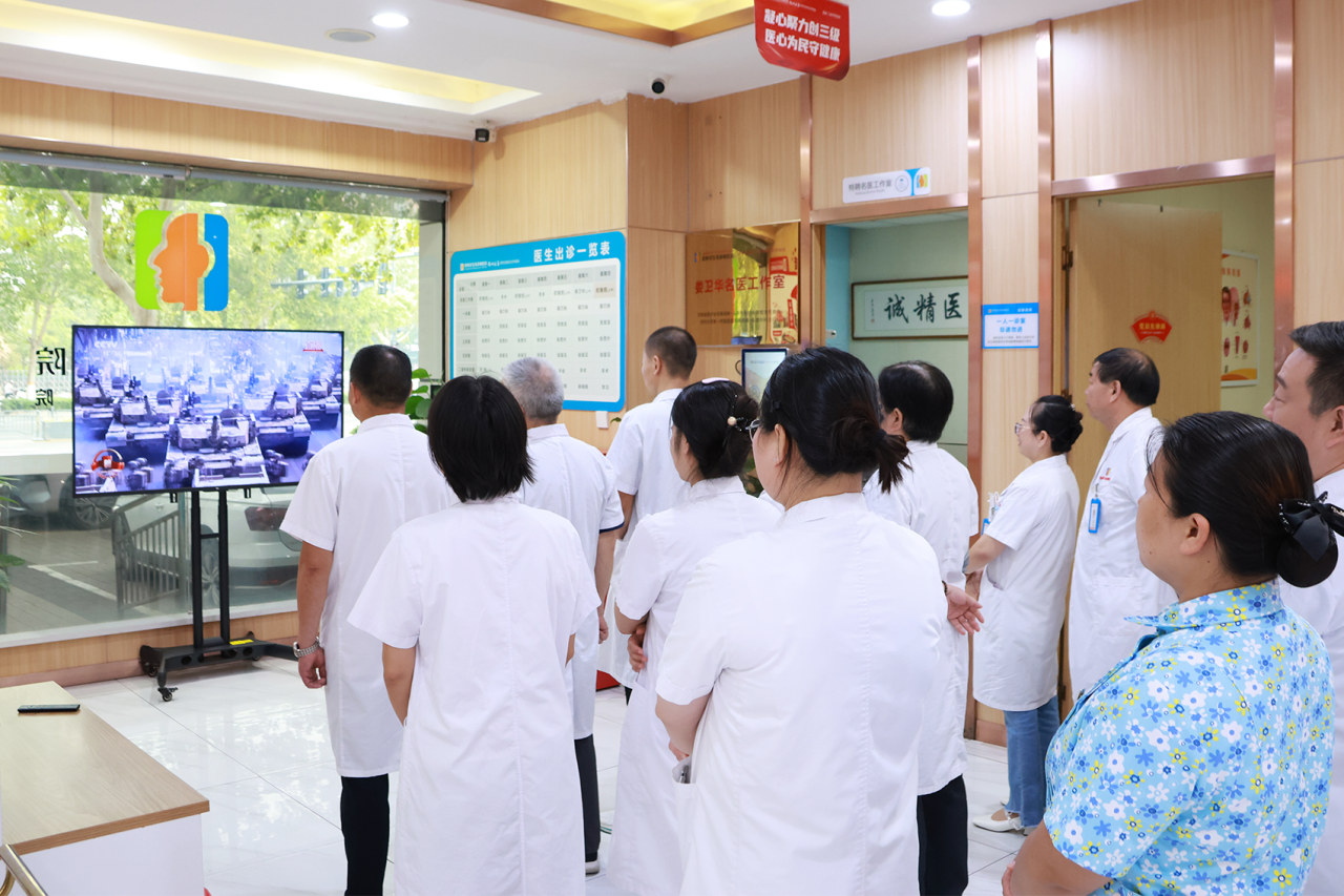 与此同时,郑州民生耳鼻喉医院在门诊各科室、住院病区组织医护人员、患者和家属同步收看阅兵仪式。