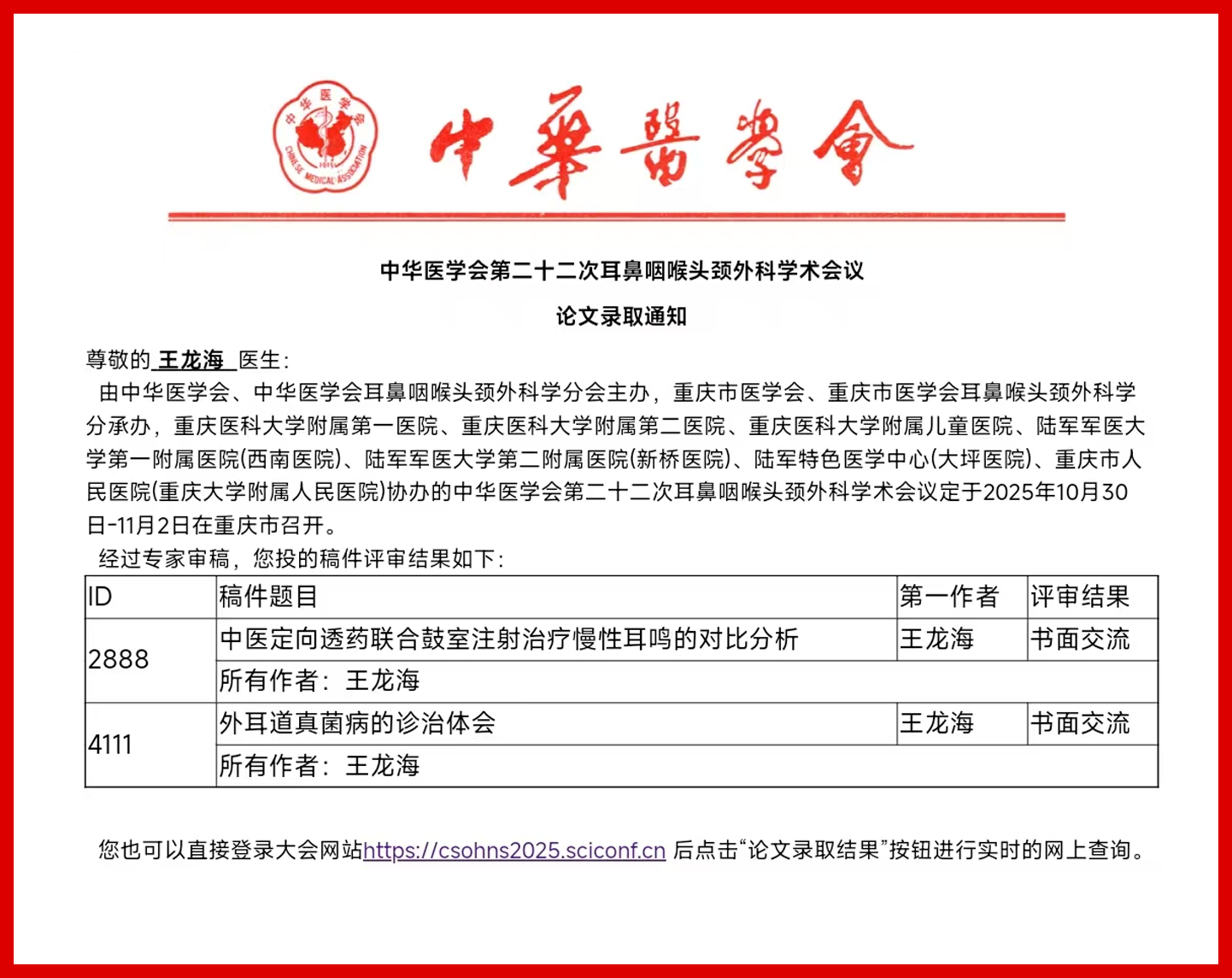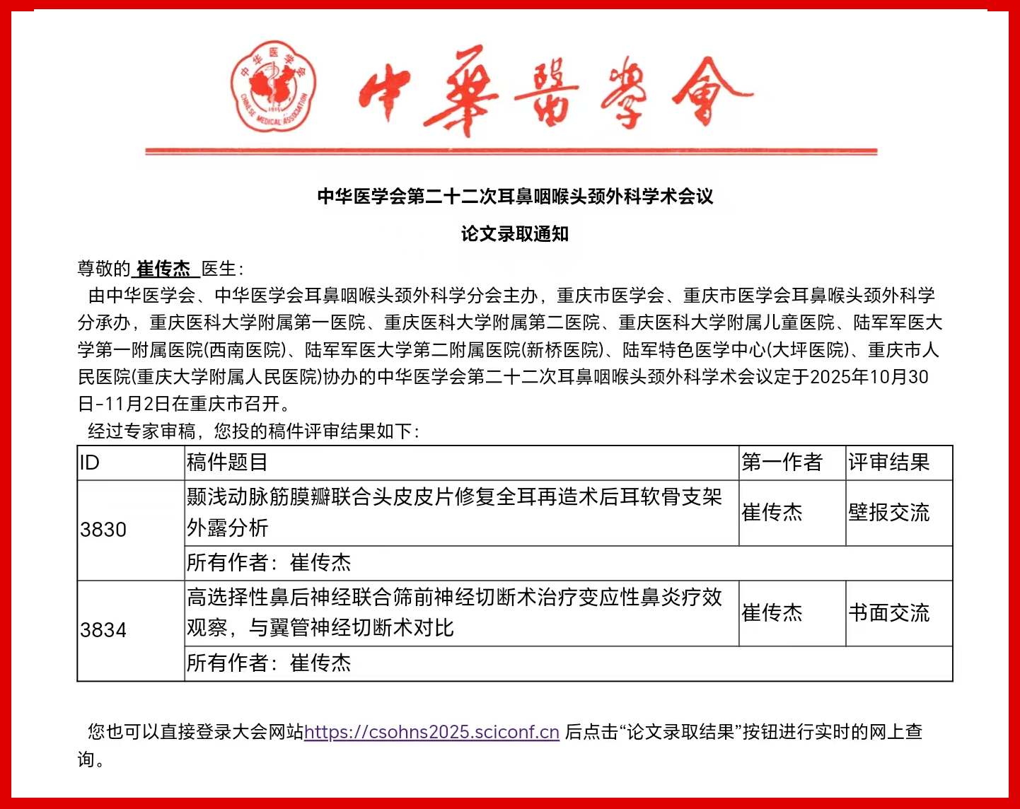 6篇论文成功入选中华医学会第二十二次耳鼻咽喉头颈外科学术会议,全部通过专家严格评审,取得